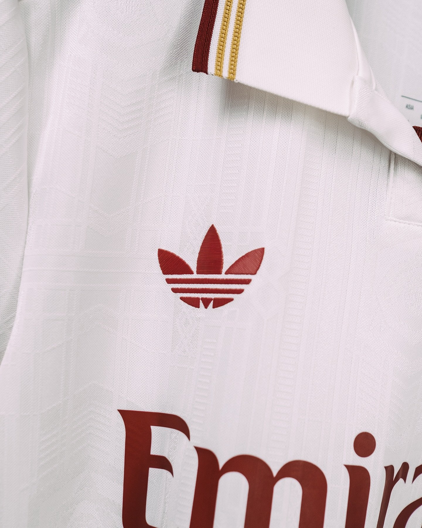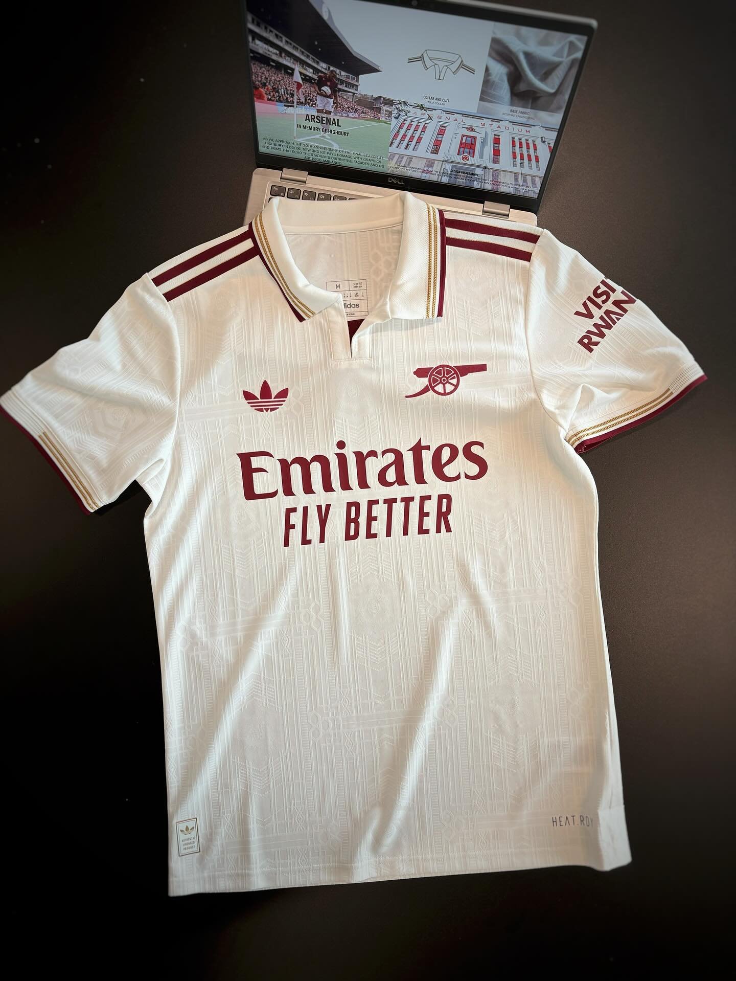 The Arsenal Third Kit 25/26, made of superior jacquard fabric, features a delicate tonal design that adds depth and texture—making it ideal for fans and collectors alike. The retro-style polo collar and gold/maroon sleeve cuffs provide a touch of classic elegance, combining nostalgia with current performance wear.